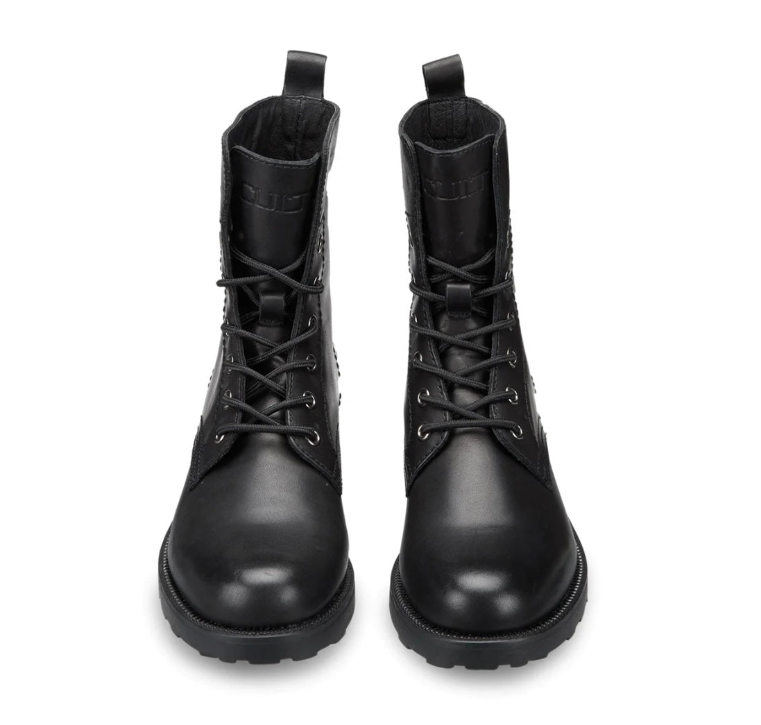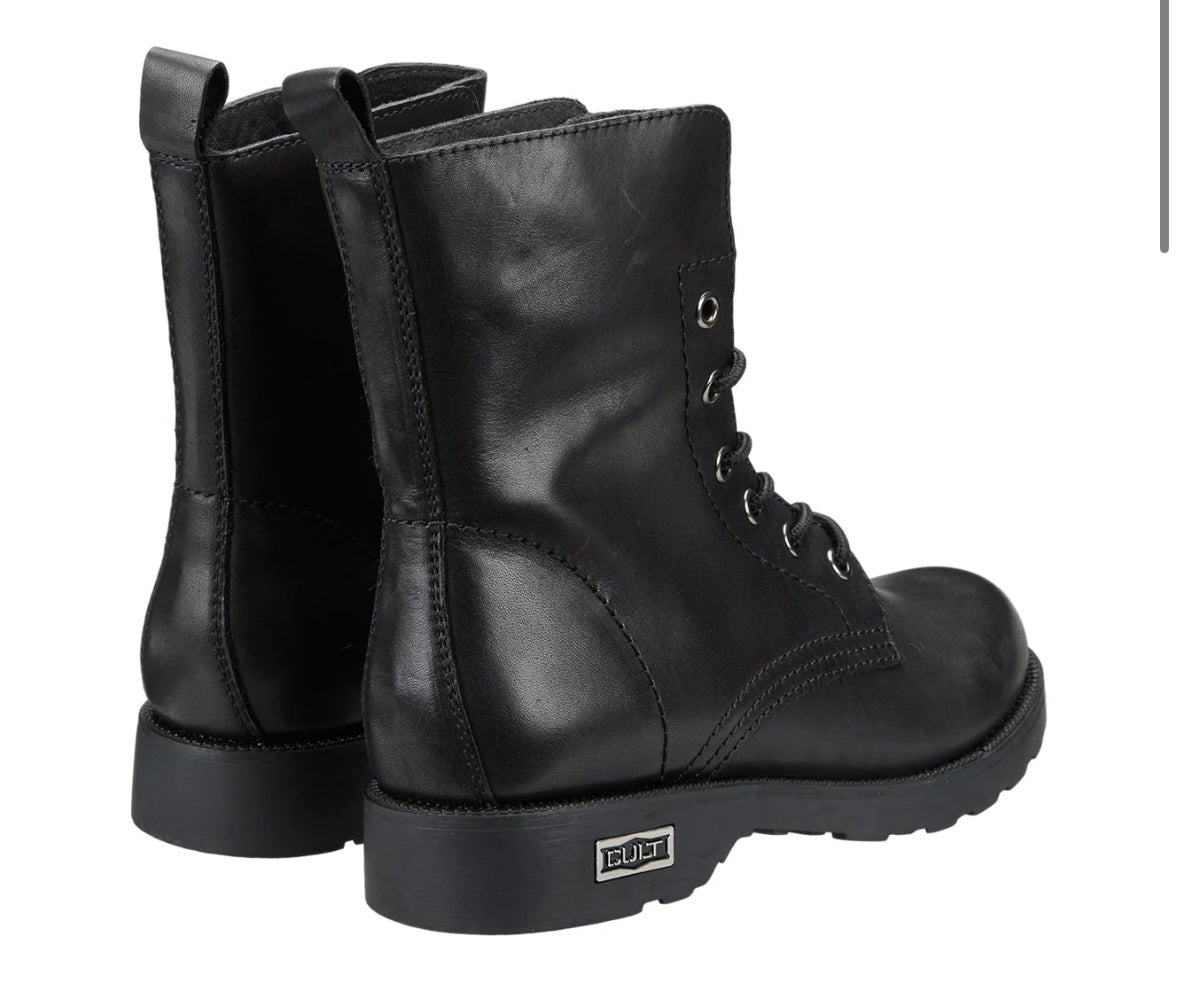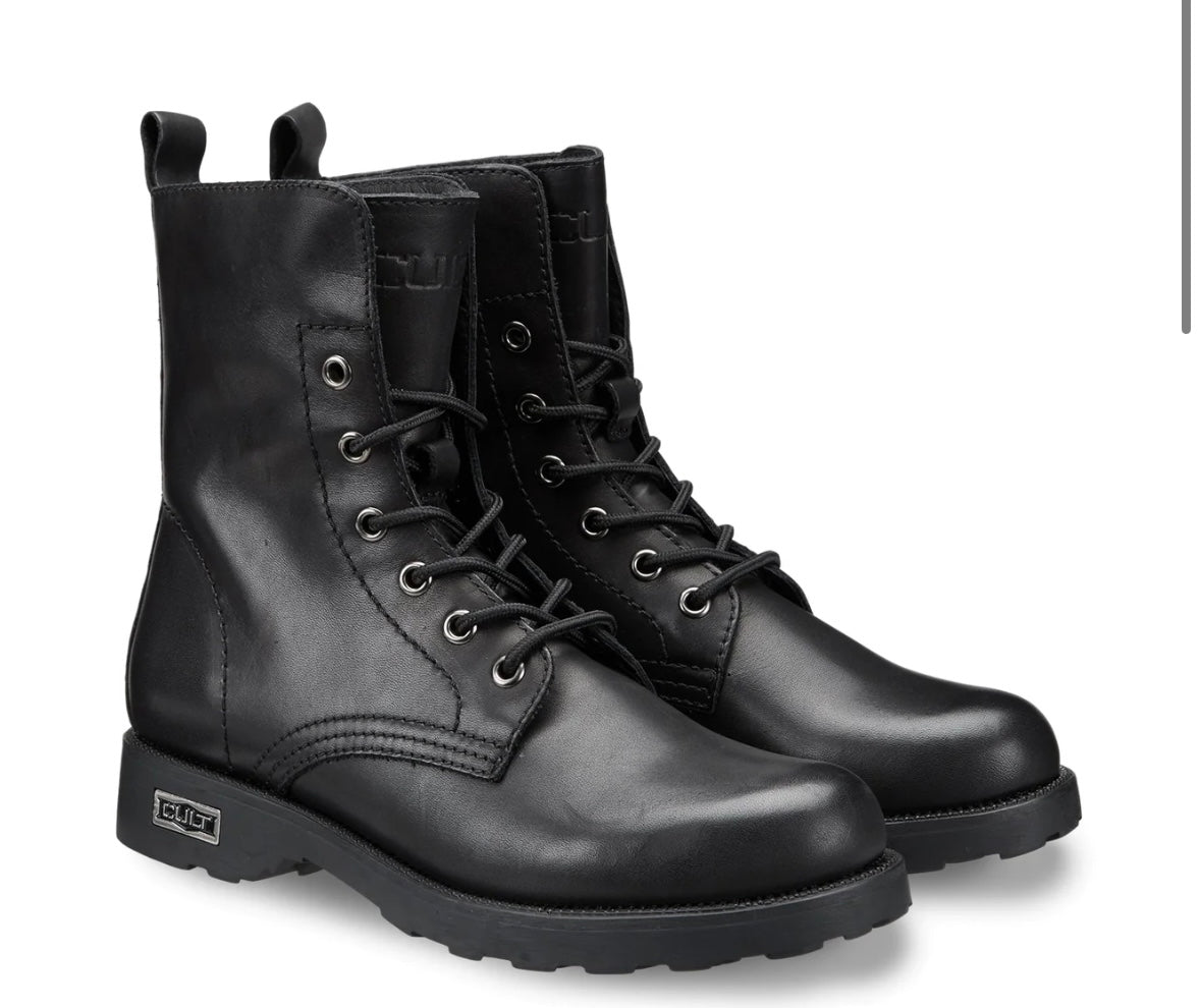 Comodi ma senza rinunciare all'anima rock gli anfibi stringati firmati da Cult per questo inverno. Un modello intramontabile di stivaletti in pelle, con occhielli in metallo, targhetta con logo sulla suola di gomma e linguetta posteriore. Da indossare con jeans, pantaloni o gonne corte.