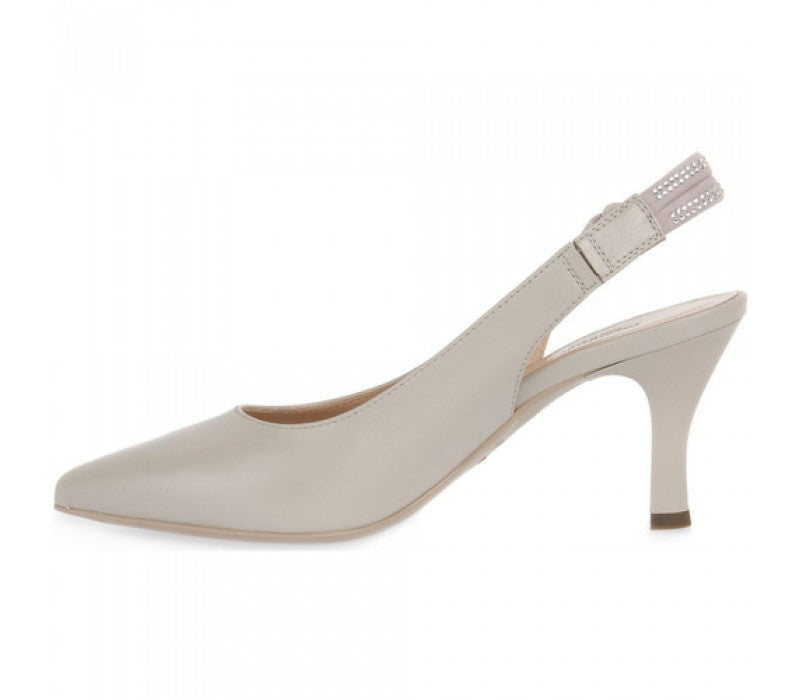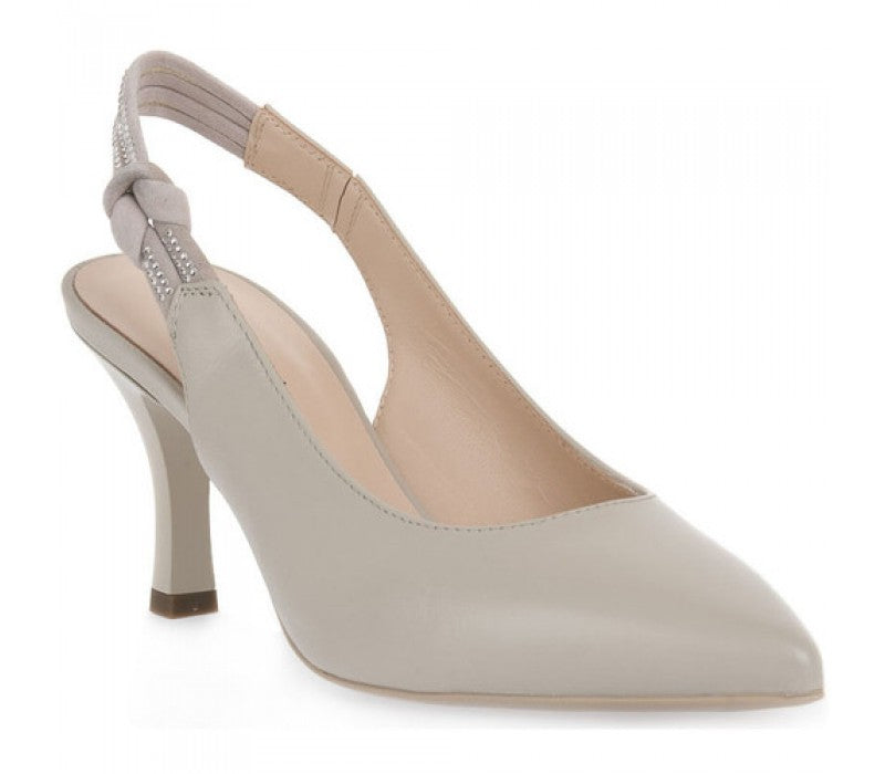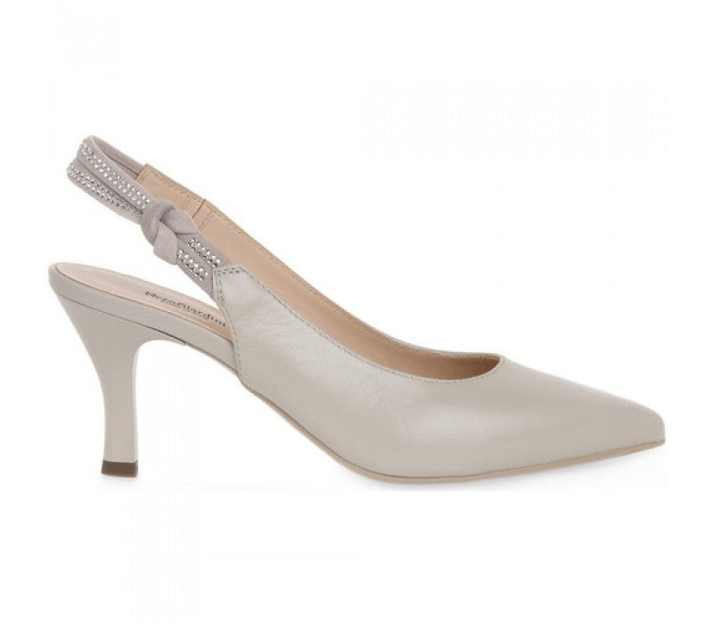 Décolleté donna in pelle Variante 143 | Colore Sand Slingback in morbida nappa con nodo laterale e listini in suede ricoperti da piccoli strass. Tacco di 7,5 cm e punta affusolata.