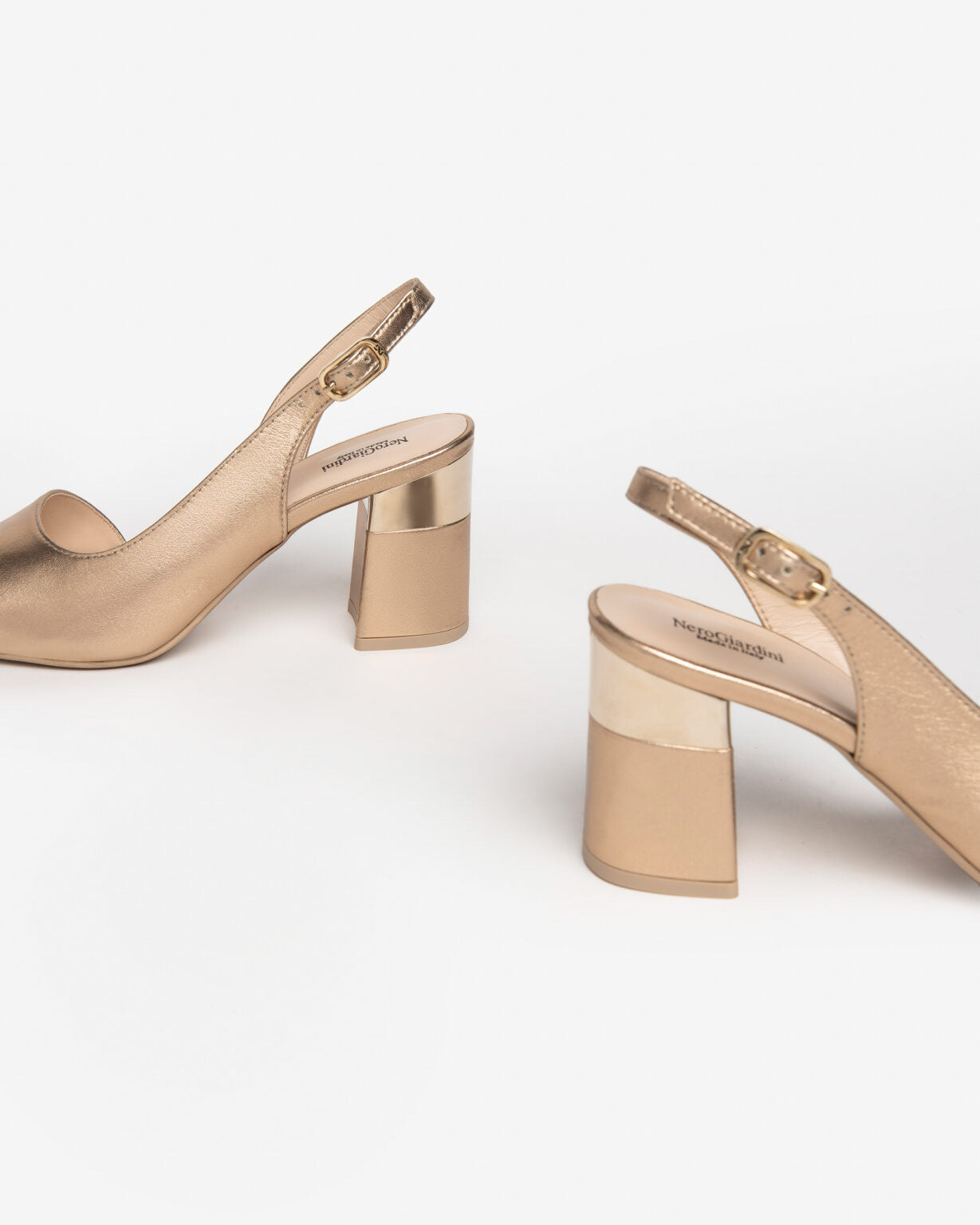 Design sofisticato per un look shiny e glam. La produzione Made in Italy delle calzature NeroGiardini è sottolineata dal tricolore impresso sulle suole e sul packaging.